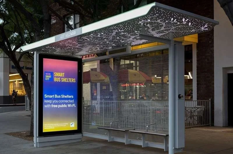JCDecaux Street Furniture and ADVANTEC Consulting Engineers installed various Smart City bus shelters and totems on Santa Monica Blvd and Sunset Blvd in an effort to enhance urban design and promote the use of public transportation options, such as Metro and City of West Hollywood.
